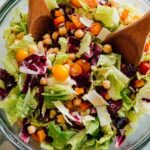 A vibrant Vegetarian Italian Chopped Salad featuring crisp romaine, slightly bitter radicchio, cherry tomatoes, chickpeas, and optional provolone cheese, all tossed in a tangy Italian vinaigrette with a hint of heat from red pepper flakes. Perfect as a refreshing side or light main.